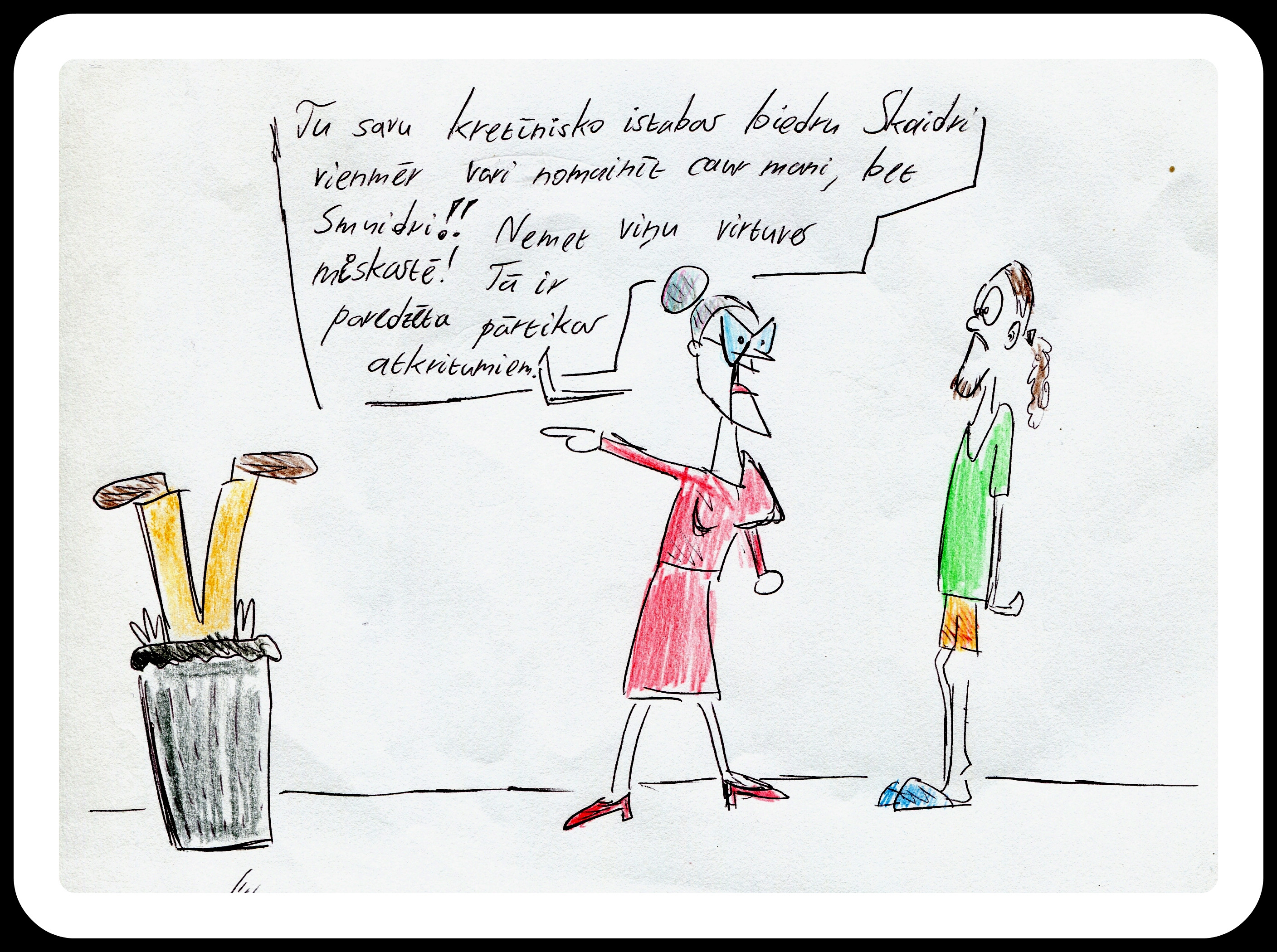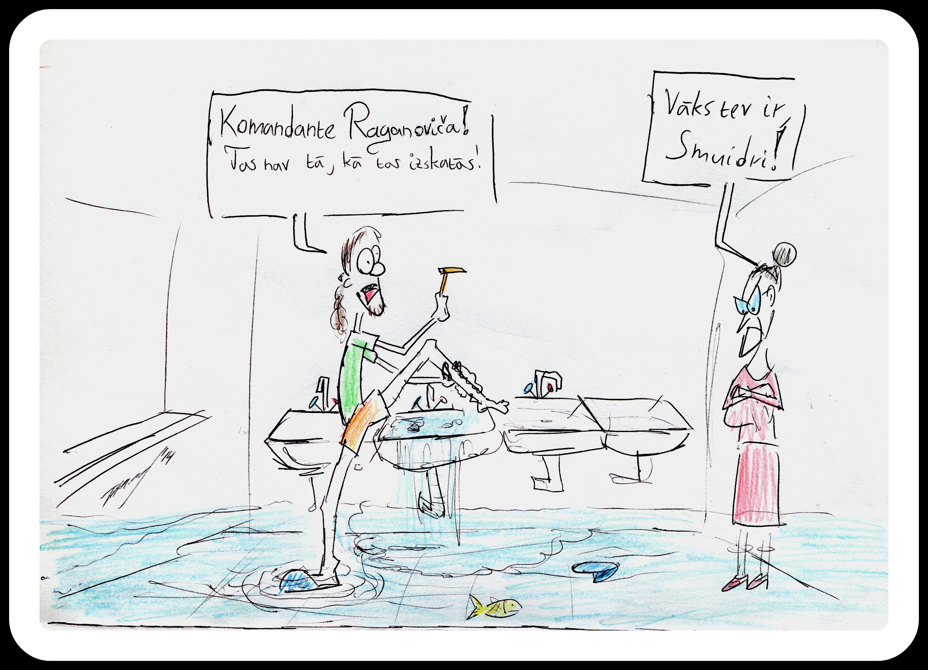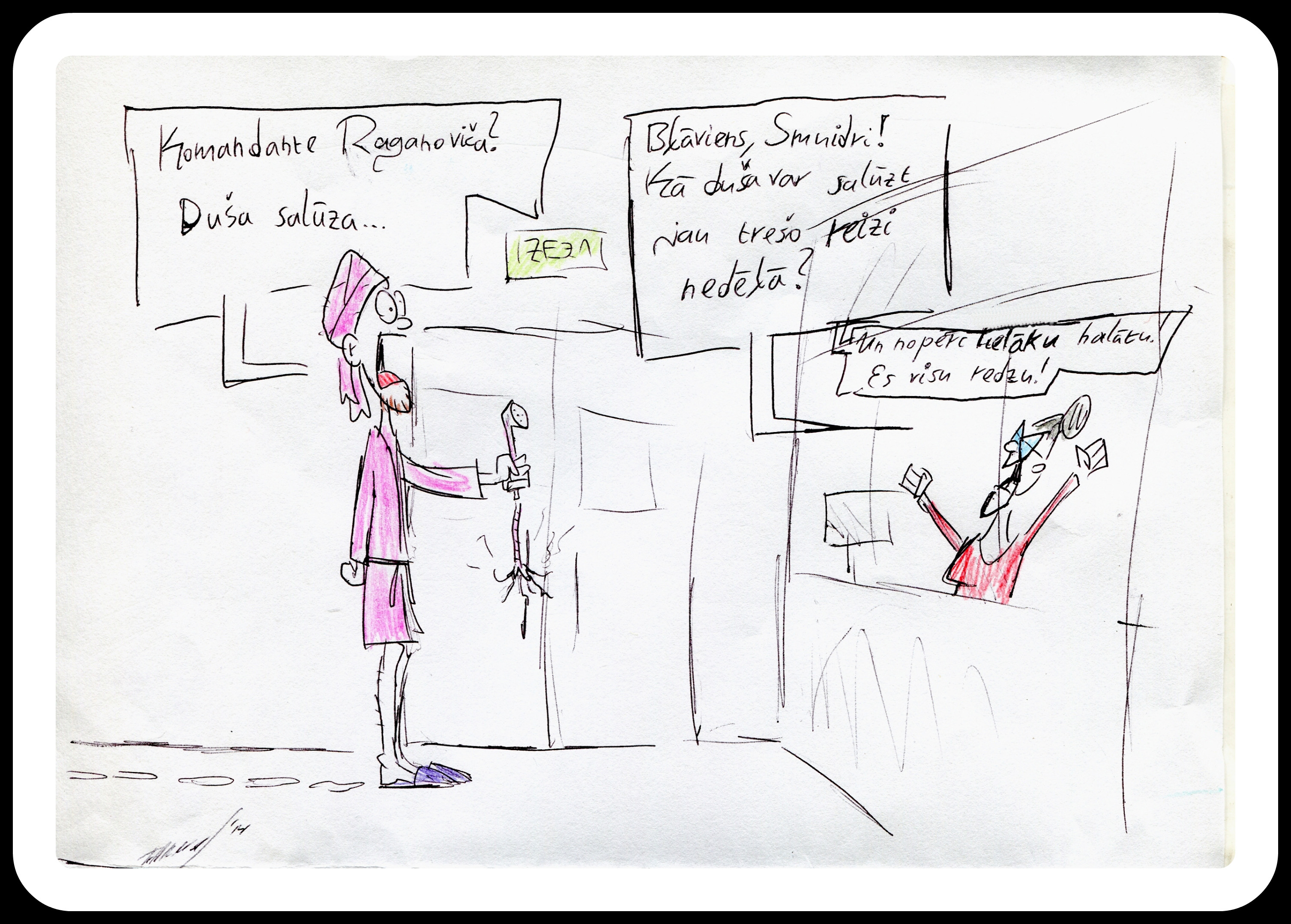 Humoristiskajos zīmējumos atainotas divas personas – students Smuidris un komandante Raganoviča.