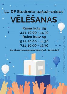 Gada tumšajam un drēgnajam laikam tuvojoties, vajadzīgs taču kāds, kas ar jauniem spēkiem uzlabo ikdienu universitātē. Nāc, izvēlies un ievēli 11.Datorikas Fakultātes Studentu Pašpārvaldes sasaukumu!