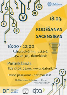 Jau 18. martā no plkst. 18:00 līdz 22:00 norisināsies īskodēšanas sacensības. Noteikumi pavisam vienkārši – dotajam uzdevumam jāuzraksta kods C++ valodā ar vismazāko simbolu skaitu. Uzdevumi nebūs sarežģīti, tāpēc nekautrējies un droši piedalies! Lai nevienam nesniegtu negodīgas priekšrocības, atļauts izmantot tikai C++ standartbibliotēkas.